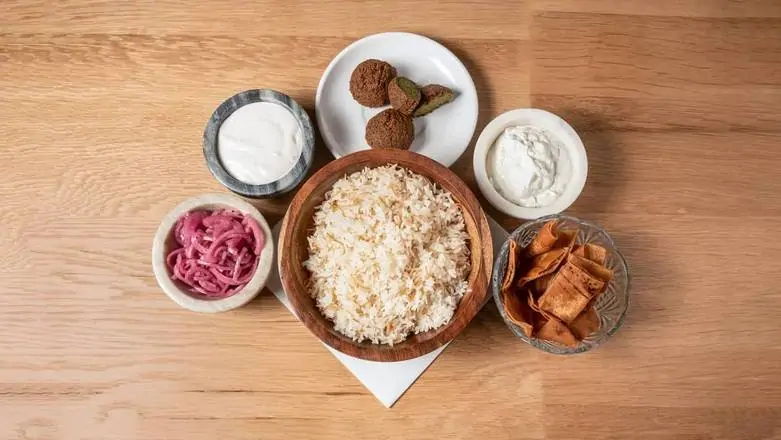 rice, tahina, toum (garlic sauce) sumac onions and